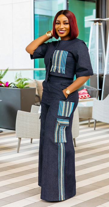 Exquisite Aso Oke & Denim Set – A Fusion of Tradition & Luxury Crafted from...