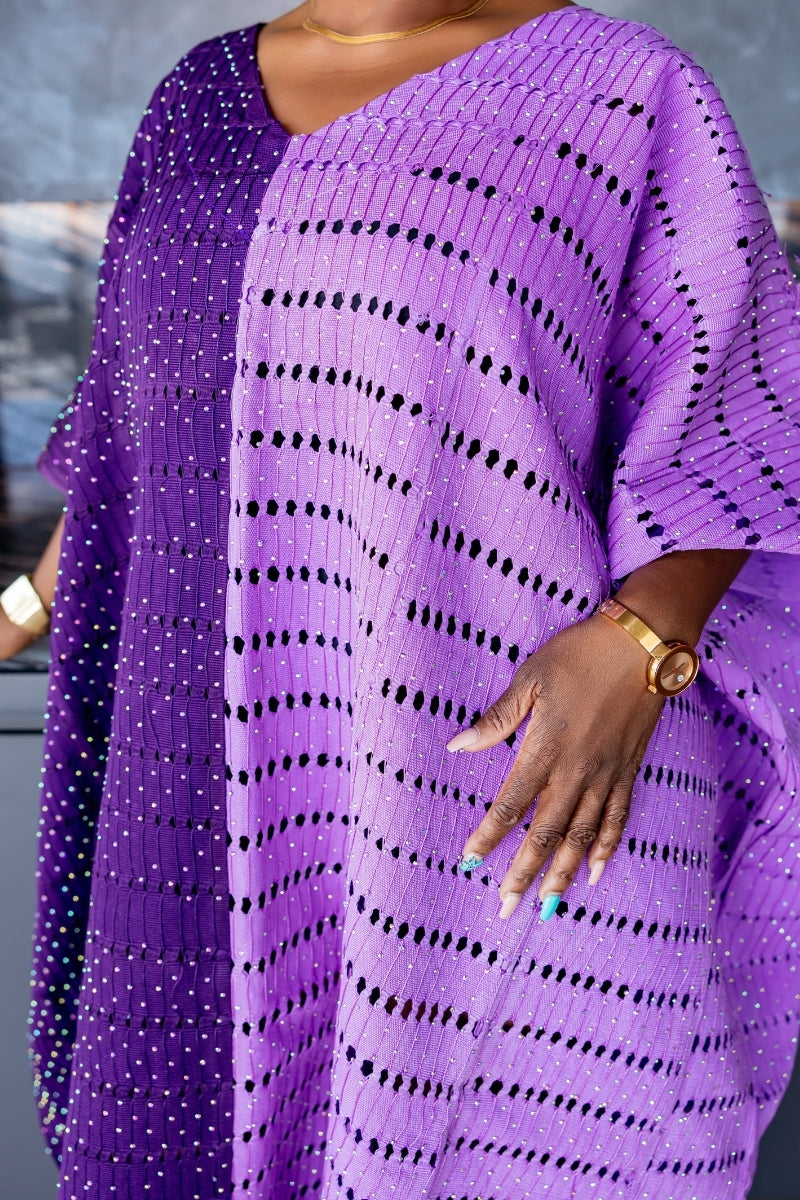 👗 Design: Crafted from premium, handwoven Aso-Oke fabric in dual tones of rich and soft purple, adorned with luxe stone embellishments for a subtle sparkle. The relaxed silhouette drapes beautifully, offering comfort and grace in every movement.