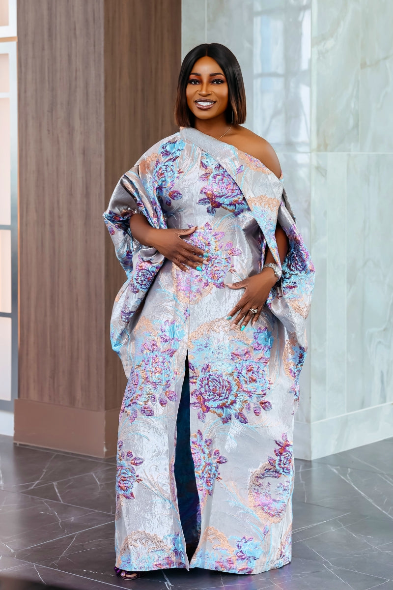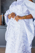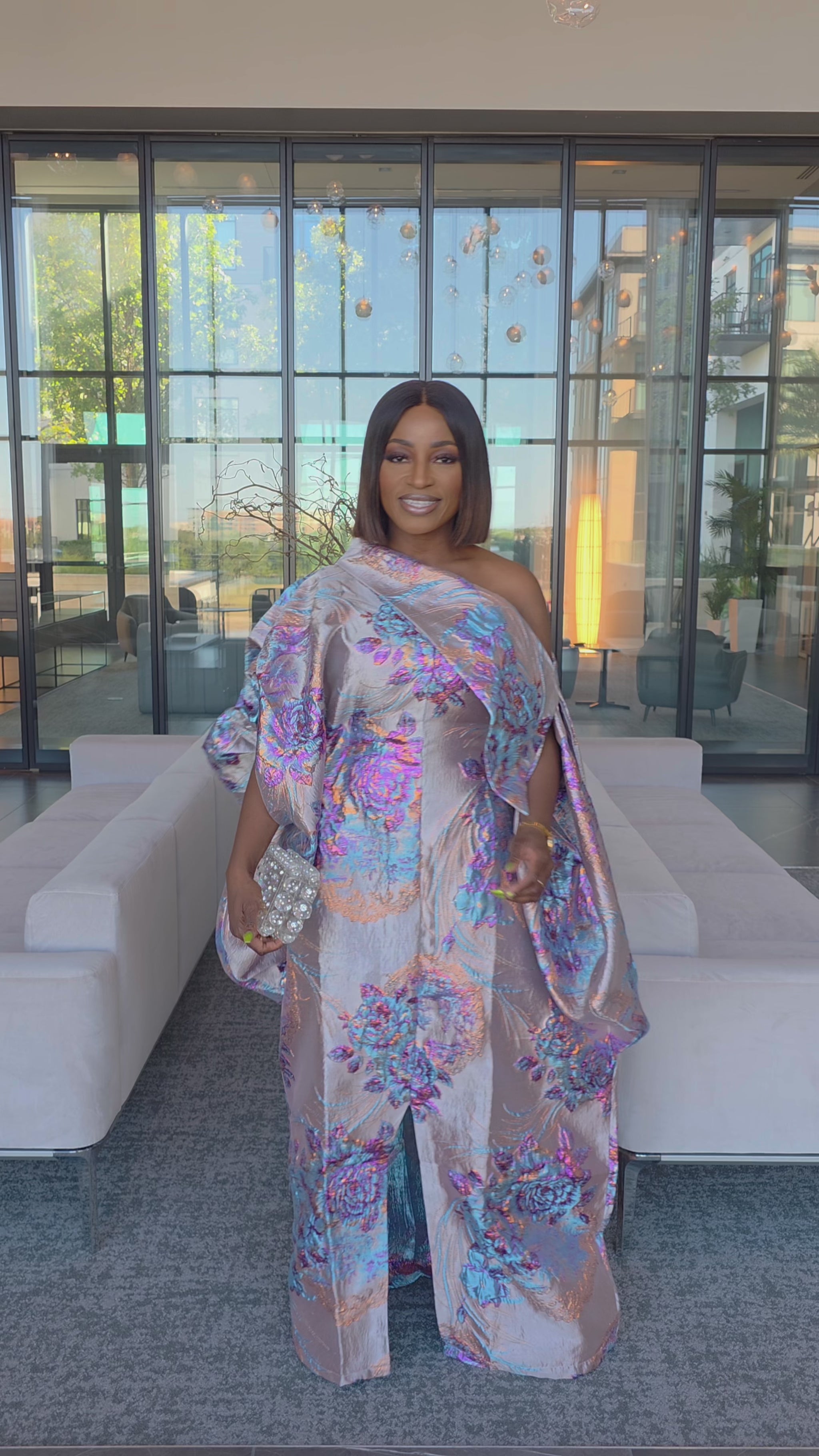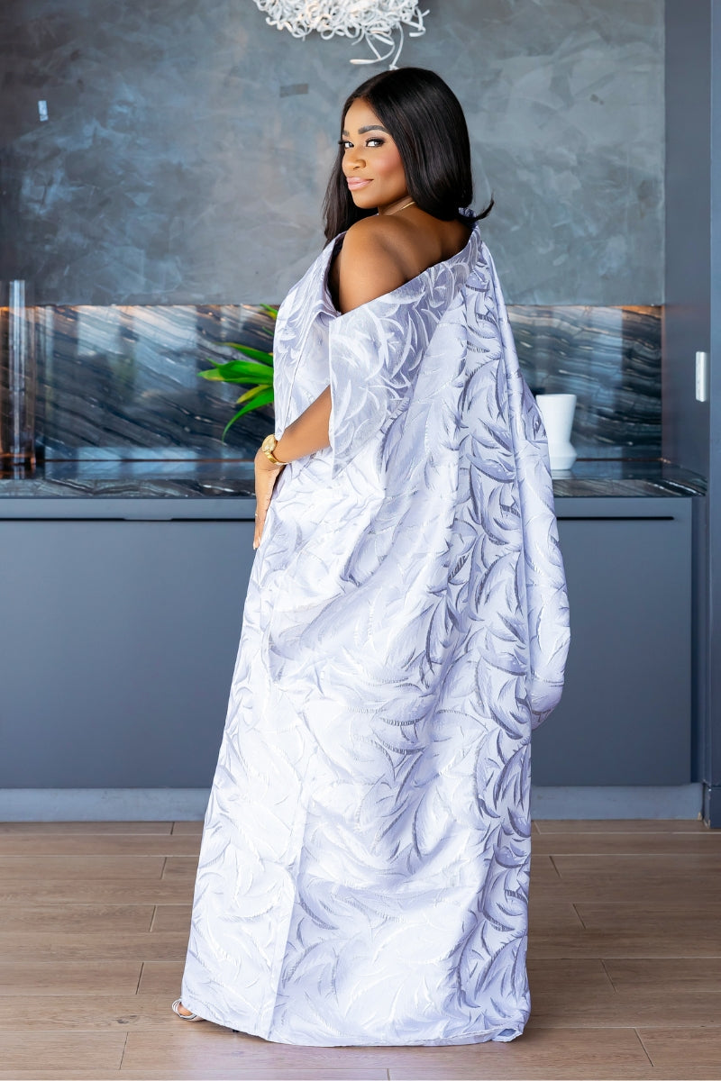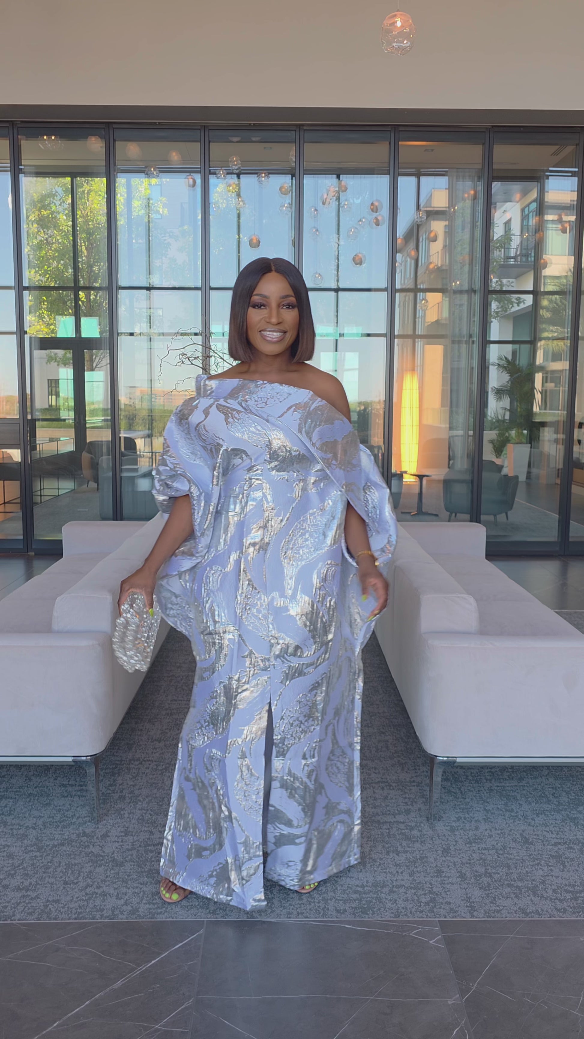 Step into timeless elegance with the Abeni Off-Shoulder Brocade Boubou Dress — a modern expression of a classic African silhouette.