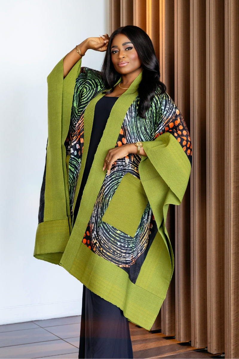 💫 Details: Features 100% cotton Aso Oke pockets and edges, wide statement sleeves, and an open-front silhouette for effortless drape and comfort.