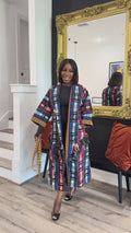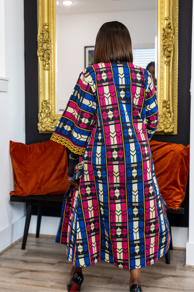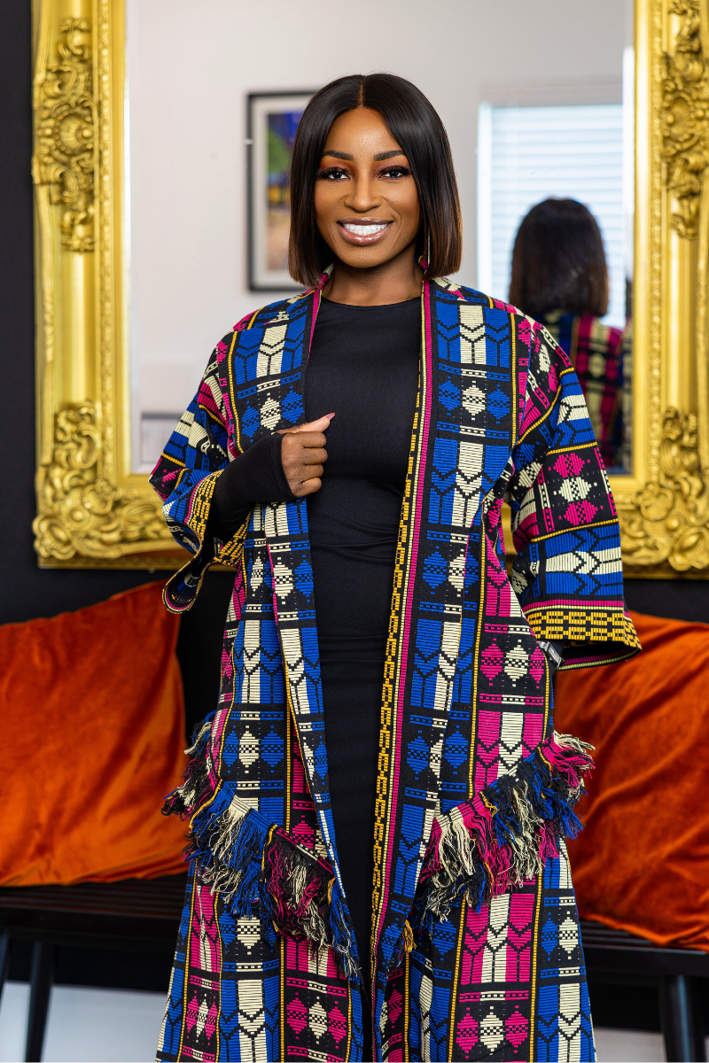 The Ama Akwete Jacket is a bold and beautifully crafted statement piece made from authentic Akwete-inspired fabric. Rich colors, intricate patterns, and artisan-level detailing make this jacket a standout addition to any wardrobe. Designed with wide sleeves, deep pockets, and delicate fringe accents, it blends cultural artistry with modern sophistication.