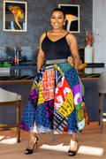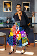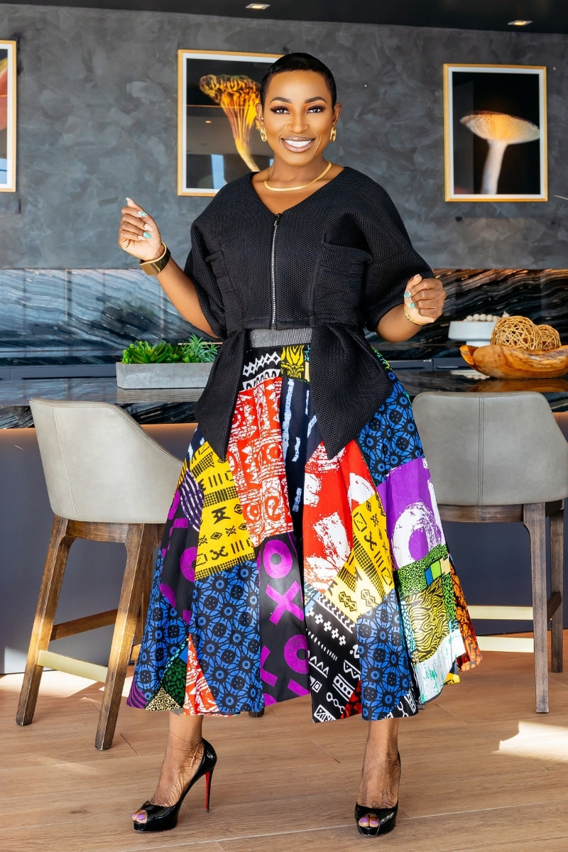 π Skirt: Made from 100% cotton Ankara fabric, featuring a stretch waistband, back zipper, and a full flare for comfort and movement.