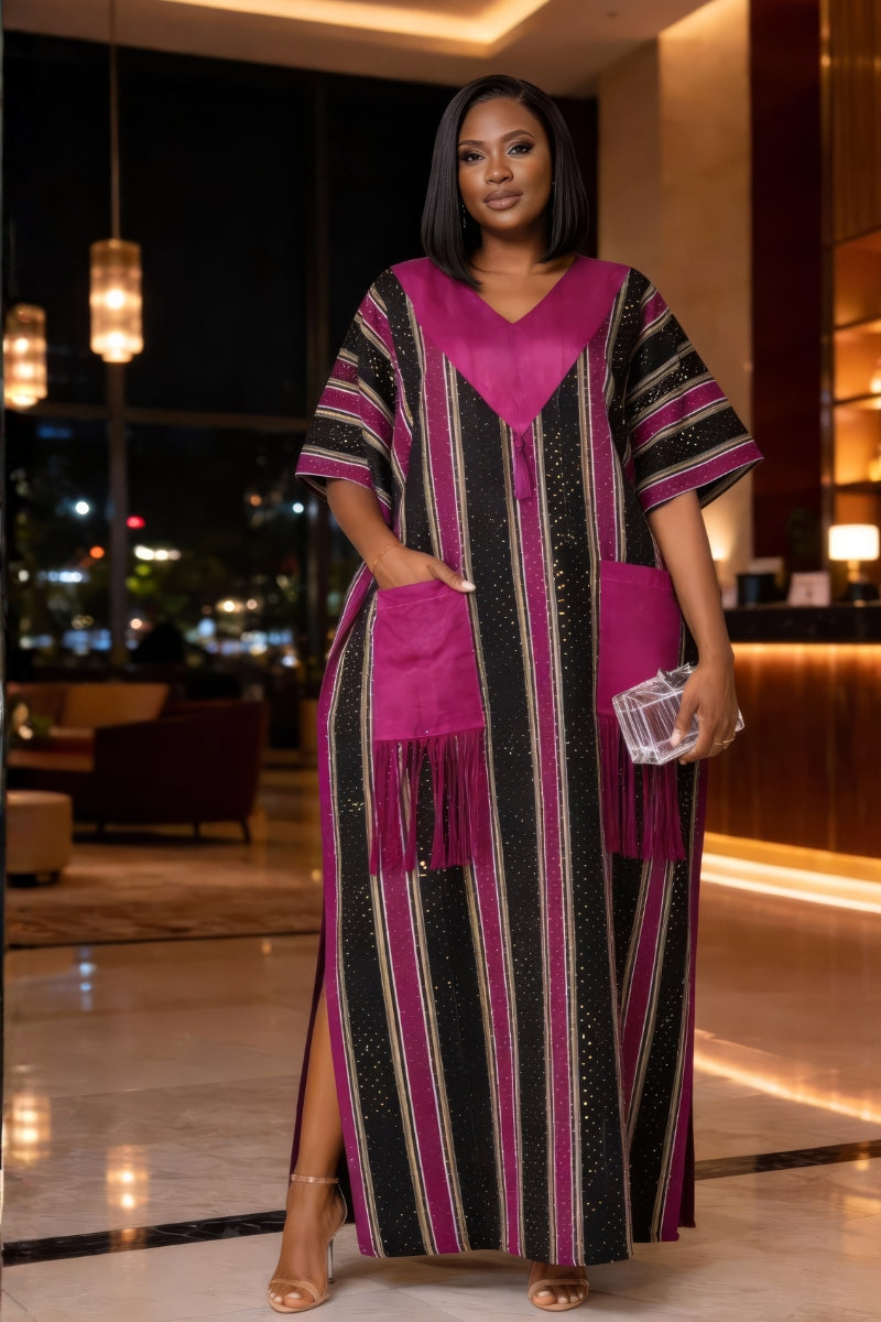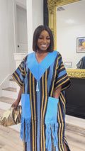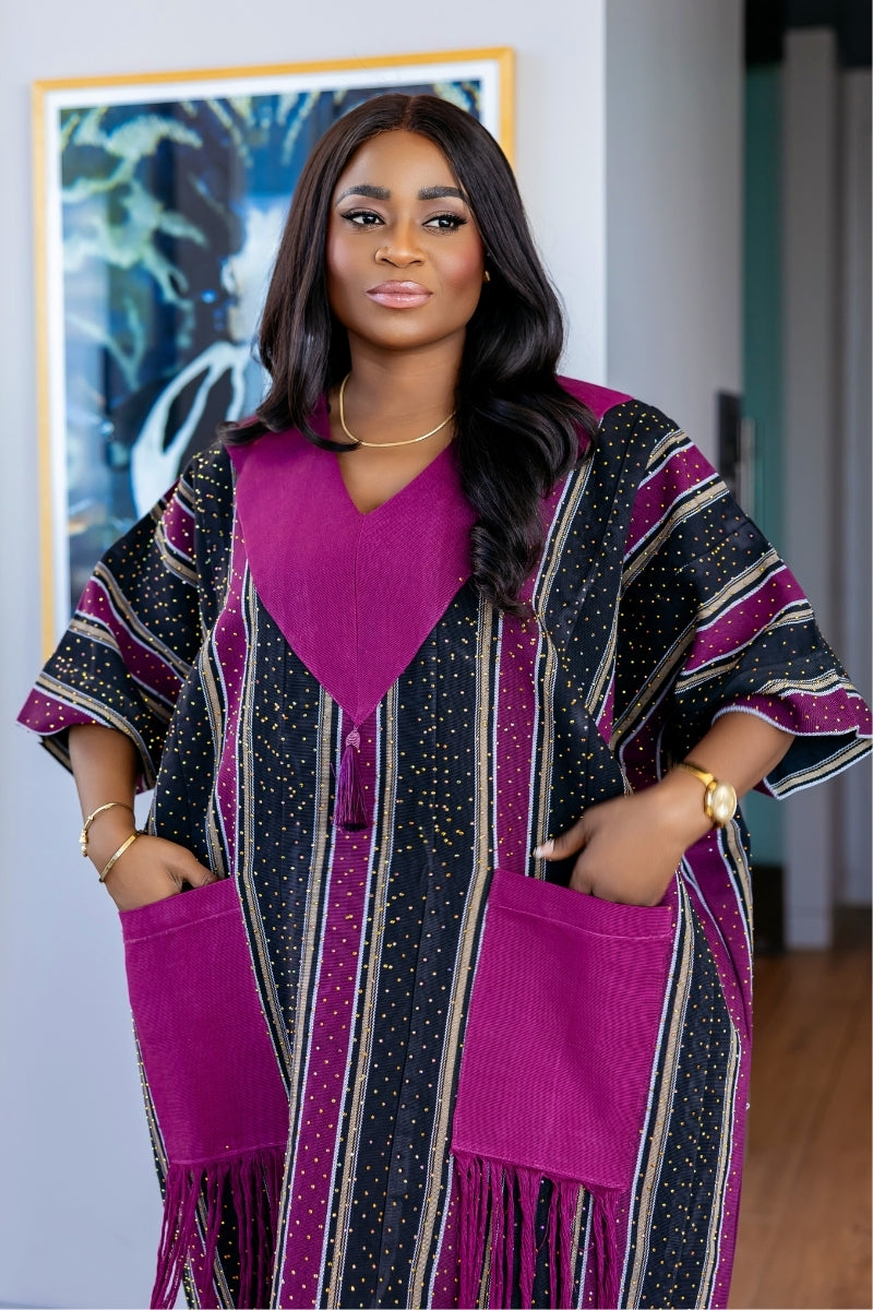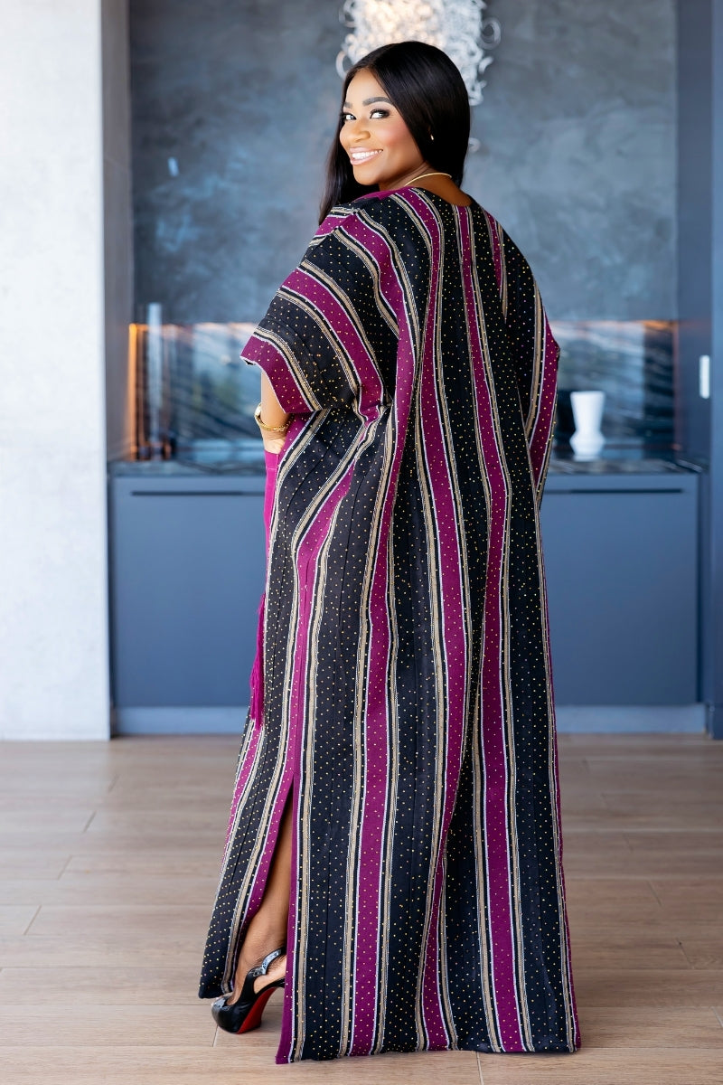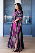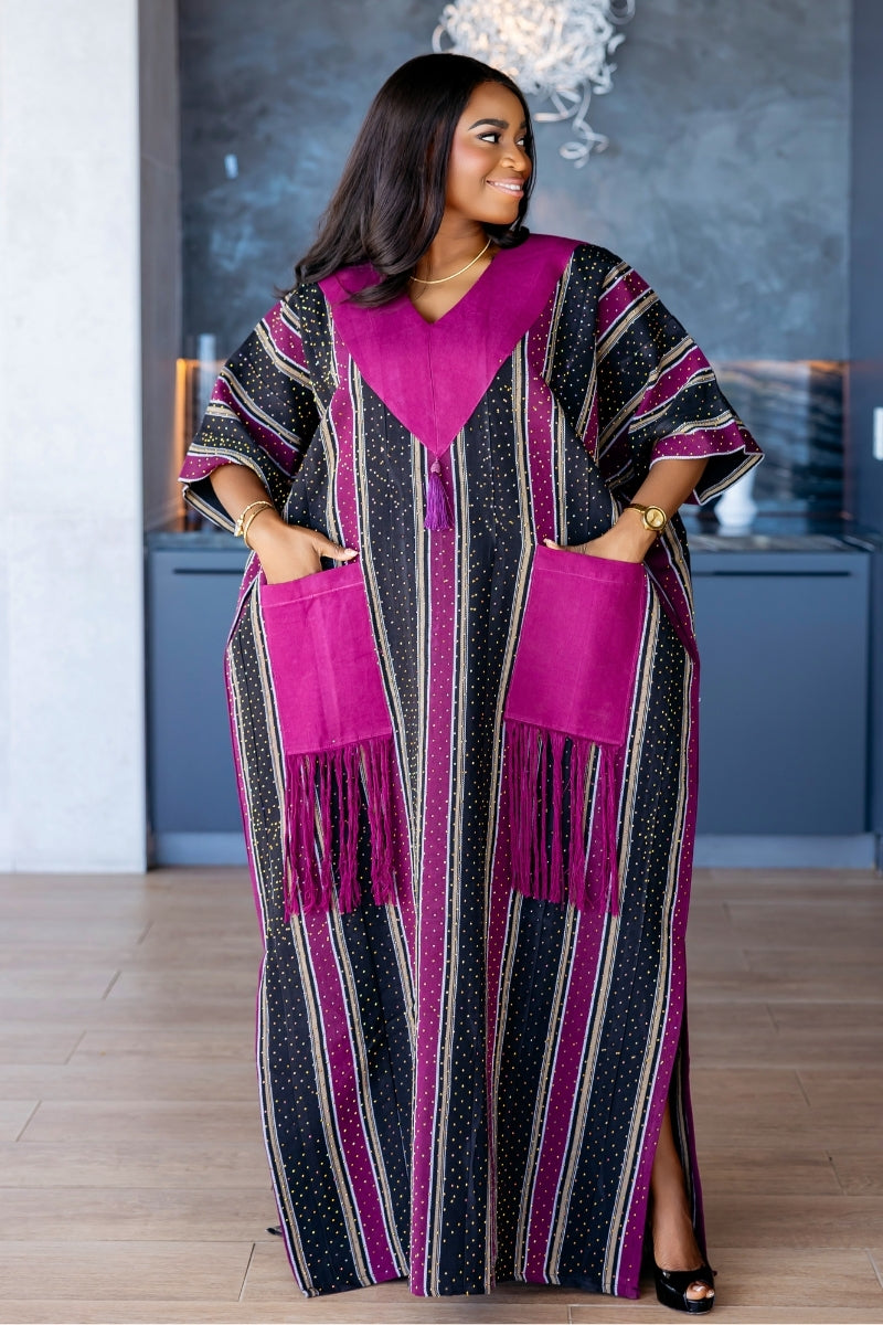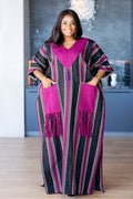 Designed with a relaxed, free-flowing silhouette, the Ayola Kaftan features a bold purple V-panel neckline, oversized patch pockets, and dramatic fringe detailing for added flair. The intricate stripes and fully stoned finish elevate this kaftan into a show-stopping piece perfect for your most special occasions.