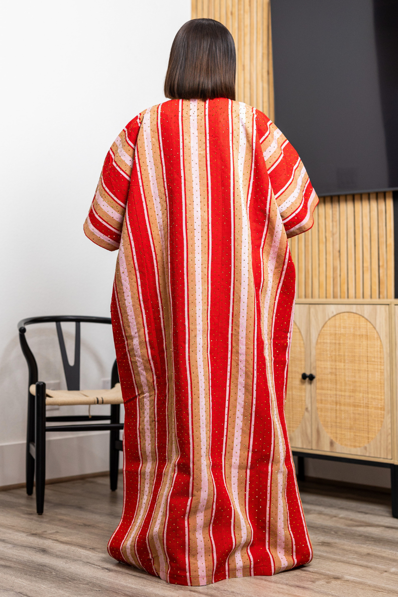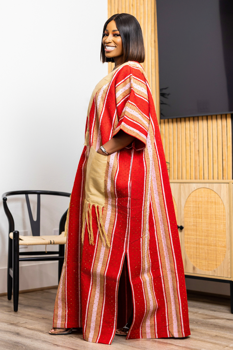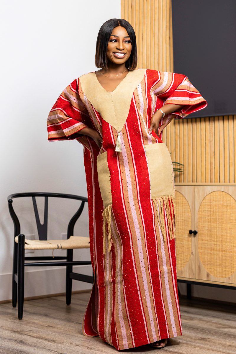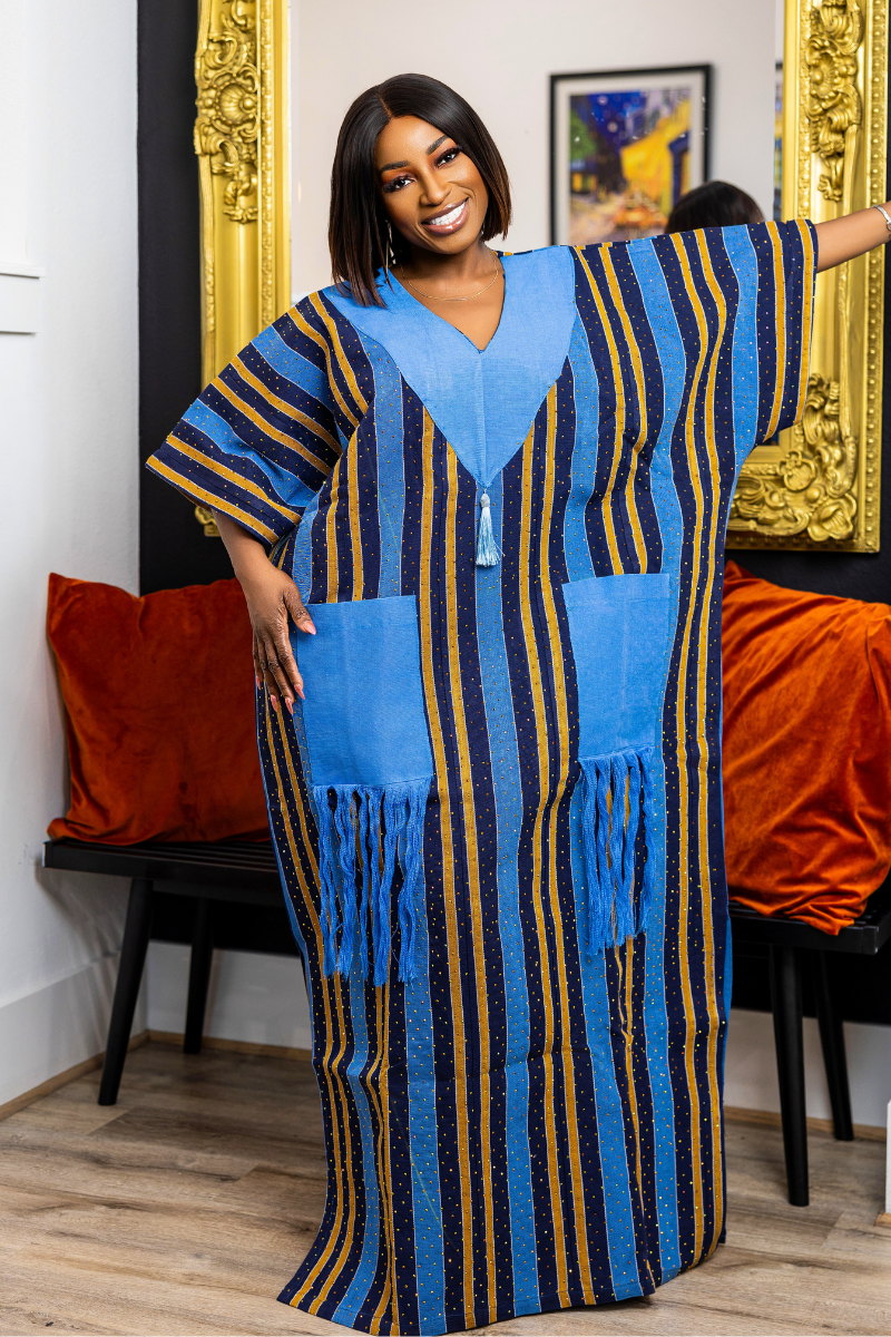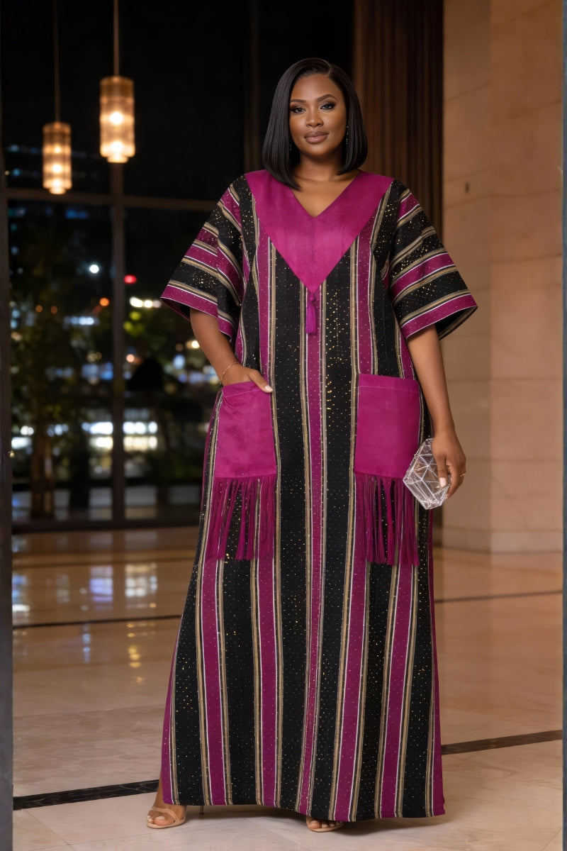 Designed with a relaxed, free-flowing silhouette, the Ayola Kaftan features a bold purple V-panel neckline, oversized patch pockets, and dramatic fringe detailing for added flair. The intricate stripes and fully stoned finish elevate this kaftan into a show-stopping piece perfect for your most special occasions.