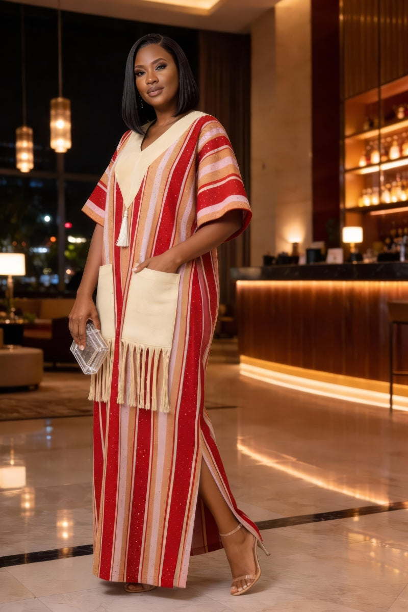 ✨ Style: Flowing kaftan with V-panel neckline, patch pockets, and fringe accents