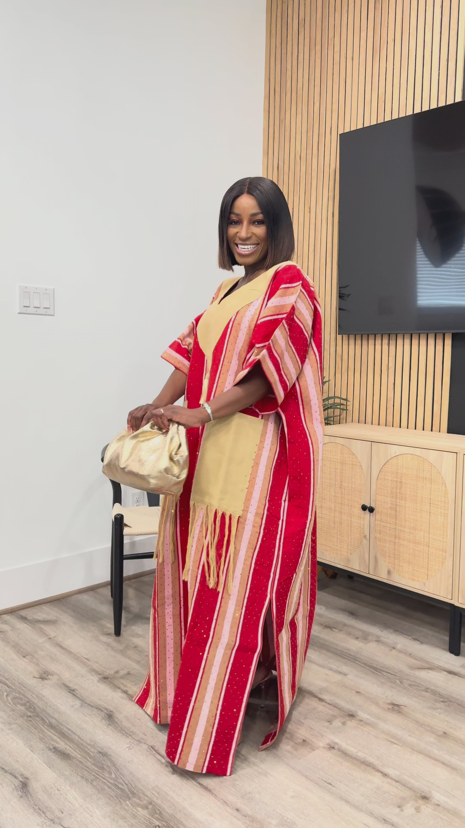 Step into undeniable luxury with the Ayola Luxe Aso-Oke Kaftan, crafted from authentic, handwoven Aso-Oke fabric and fully embellished with dazzling rhinestones that shimmer beautifully with every movement. This masterpiece blends rich cultural heritage with high-end glamour, creating a look that is regal, radiant, and truly unforgettable.