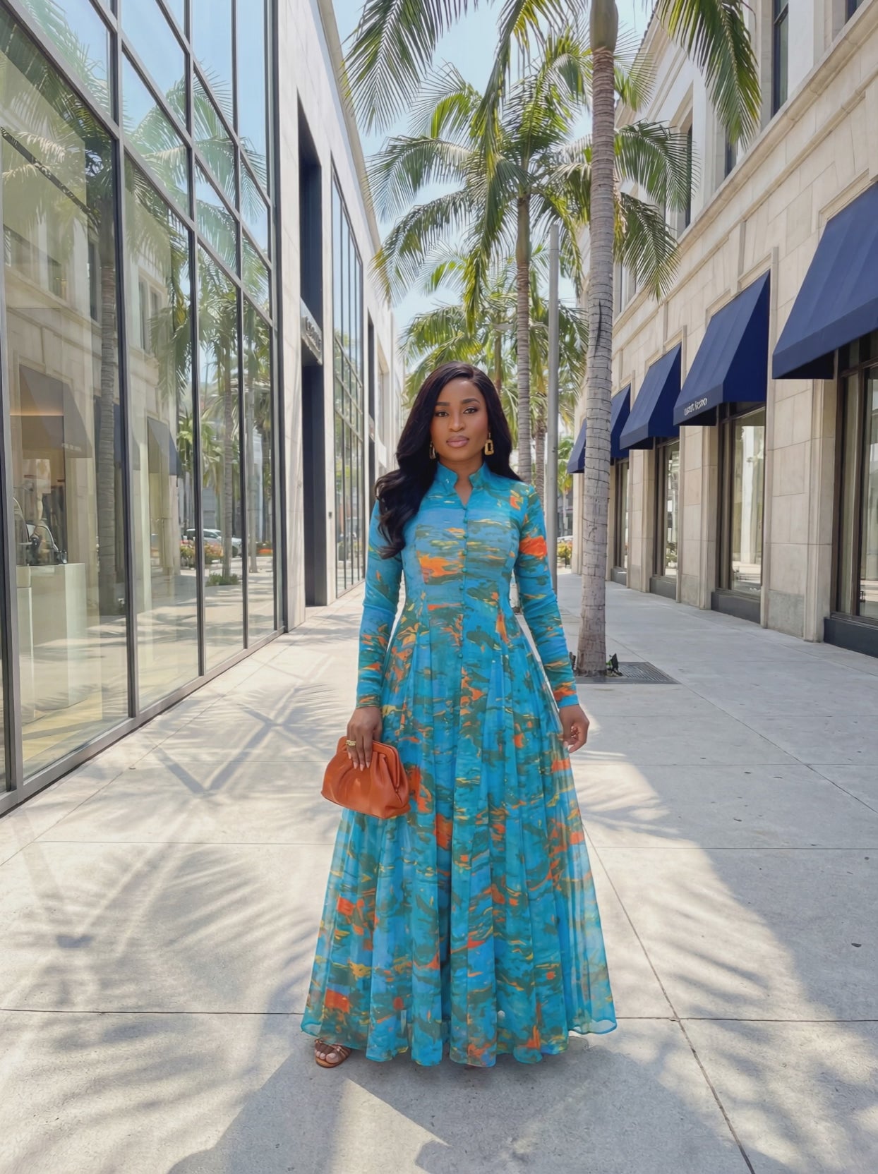 Effortless and striking, the Azure Coast Maxi Dress features a flowing full length silhouette in a bold abstract print. Crafted from lightweight mesh fabric, it offers an airy feel with soft movement and a flattering fit and flare shape. Finished with a refined neckline and long sleeves, it’s perfect for both daytime elegance and elevated evenings.