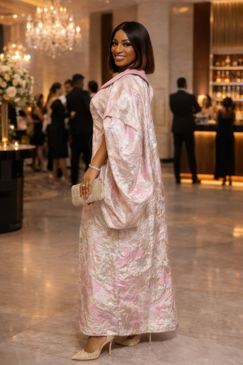Crafted from premium brocade fabric, the Chiney Dress carries a soft sheen and rich texture that radiates royalty. With its large Collar neckline with Chantilly lace, and very voluminous sleeves, this statement piece strikes the perfect balance of bold and graceful — letting you showcase your confidence while embracing modest sophistication.