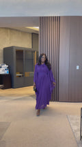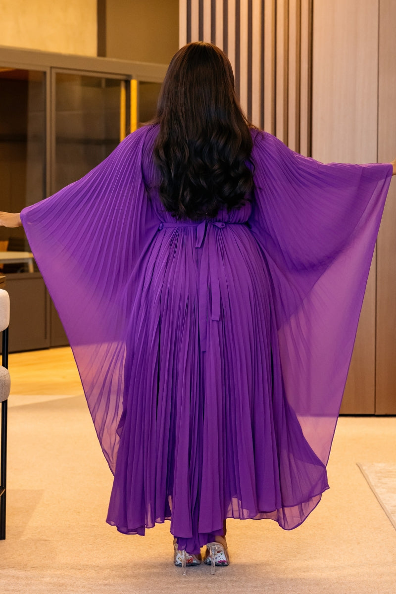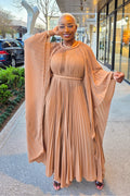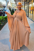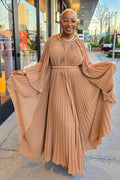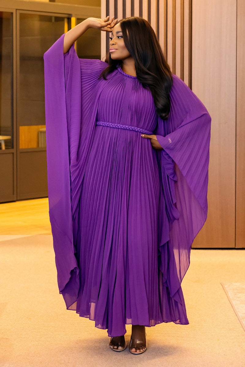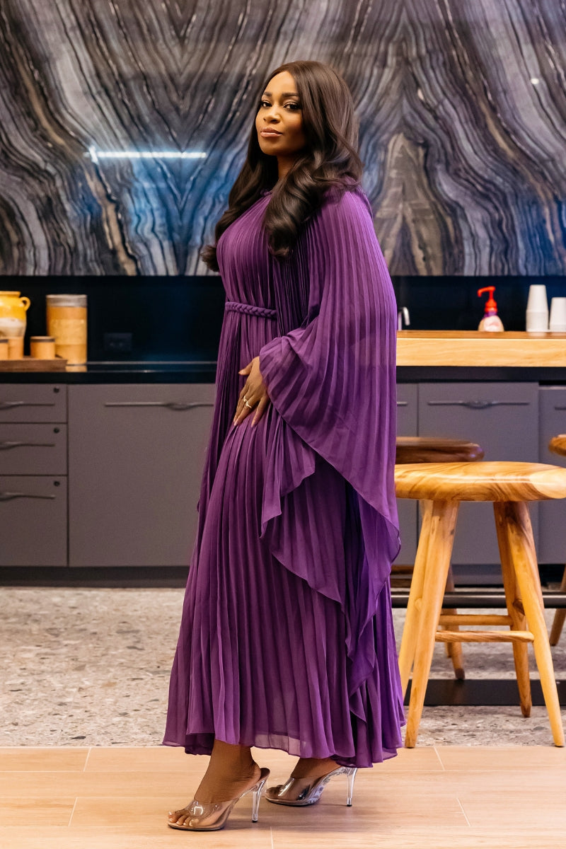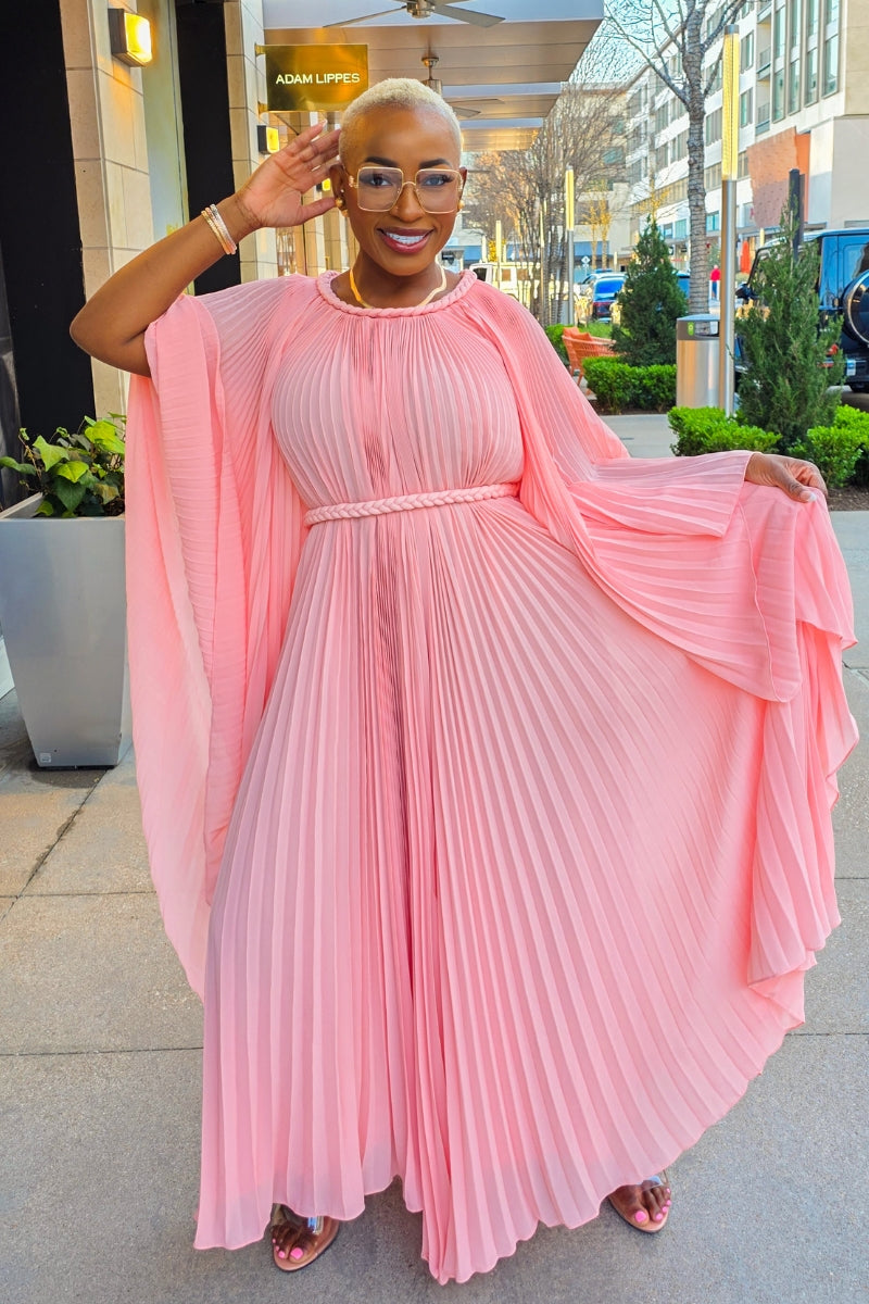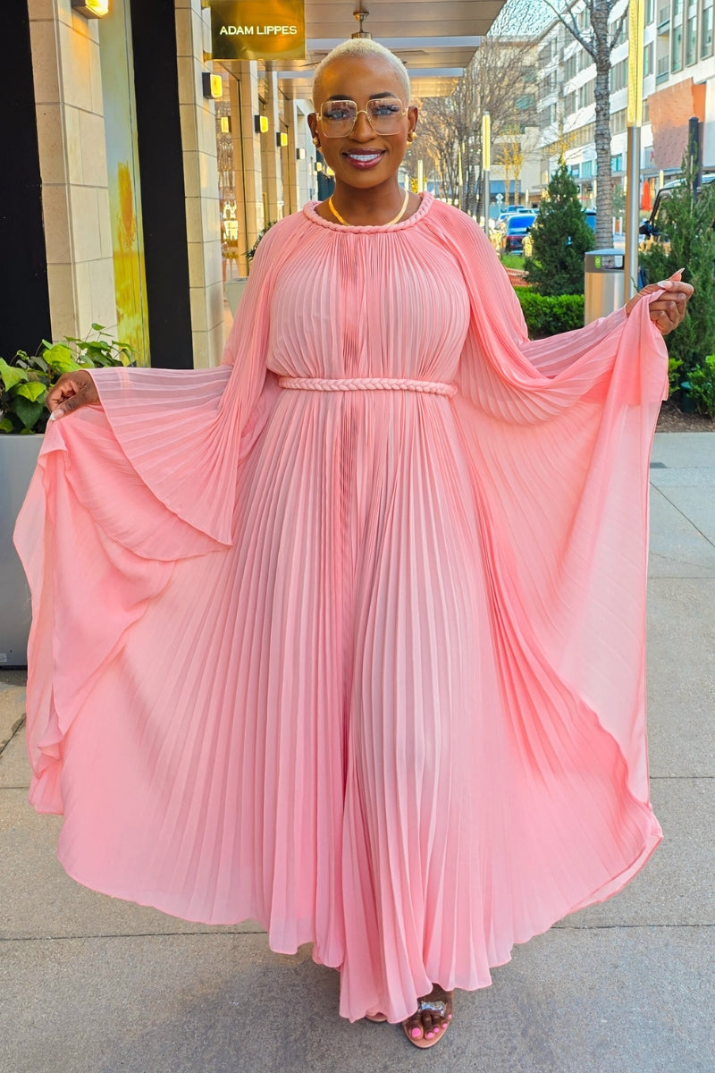 Make a stunning statement in the Hannah dress. This pleated beauty moves with grace and elegance, creating an effortless yet elevated look. Crafted from lightweight, flowy fabric, Hannah features wide, dramatic sleeves and a braided belt to define the waist—offering a flattering and sophisticated silhouette.