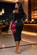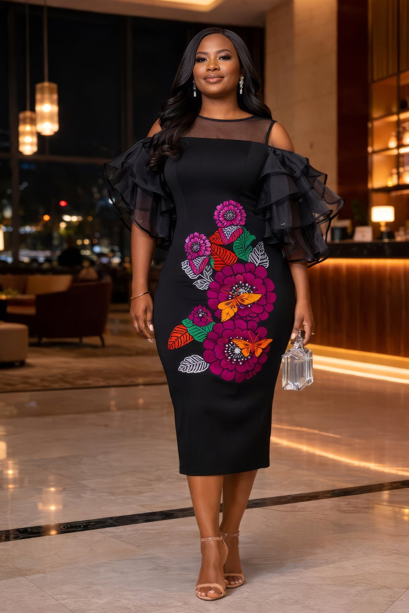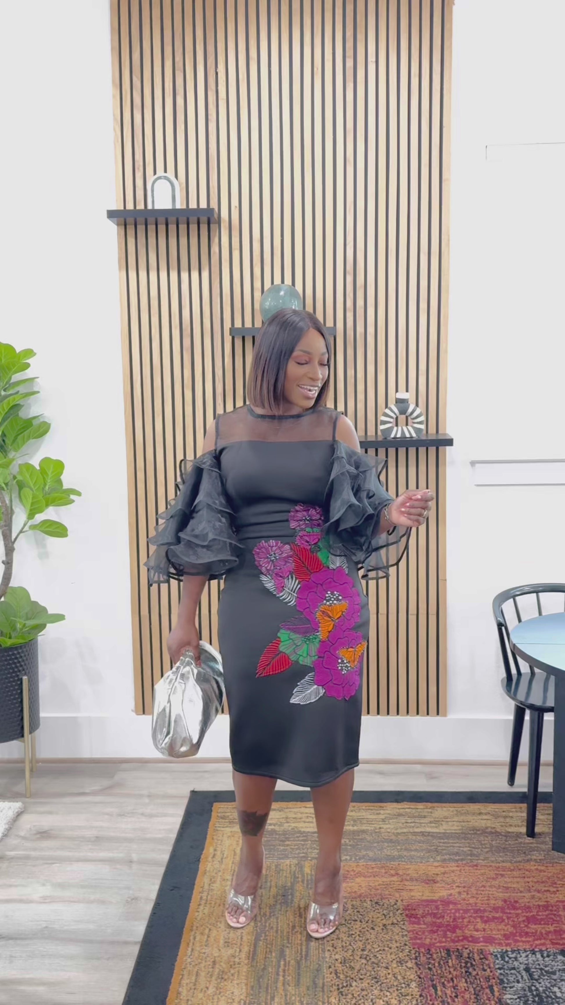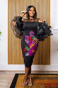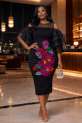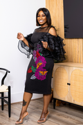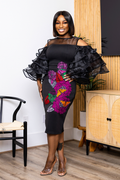 The Jackie Dress is a beautiful blend of sophistication, femininity, and modern elegance. Designed with a smooth scuba body that offers a flattering fit with a bit of stretch, this midi-length dress features a stunning hand-detailed floral Ankara applique that adds color, artistry, and grace. The sheer neckline introduces a soft touch of elegance, while the layered organza ruffle sleeves create a bold, stylish statement.