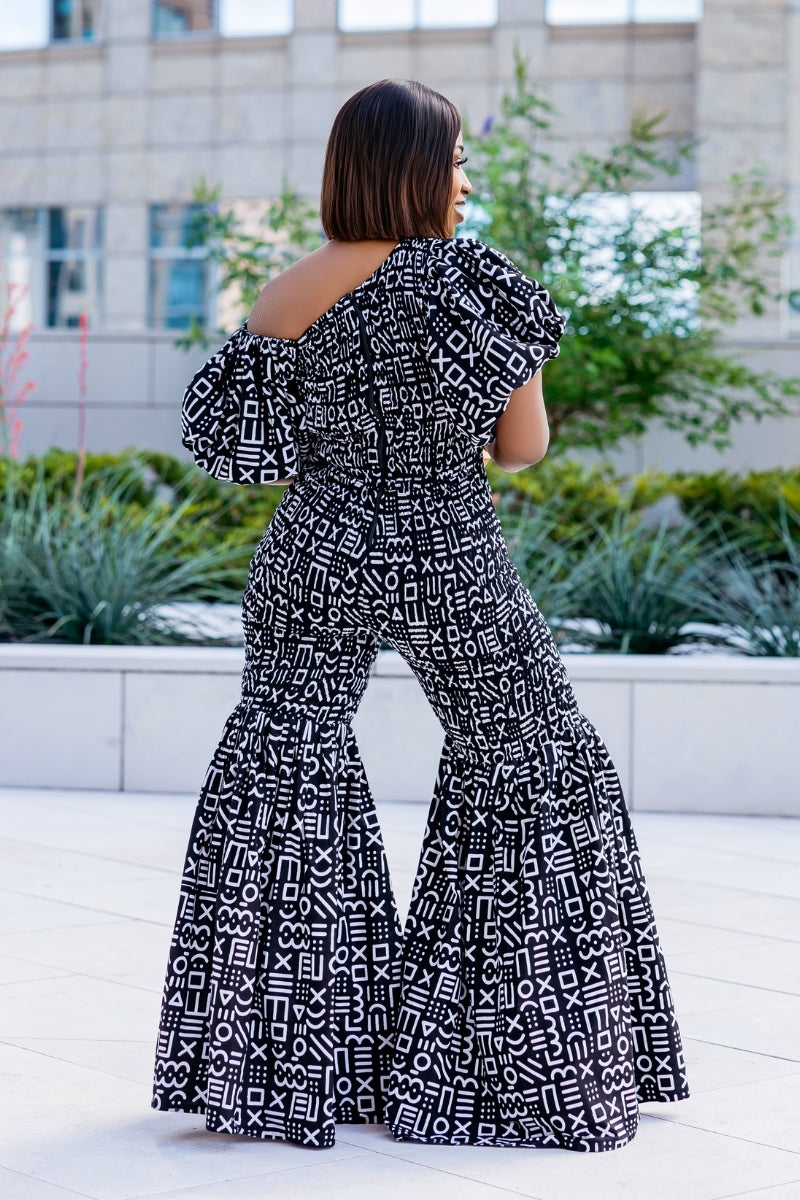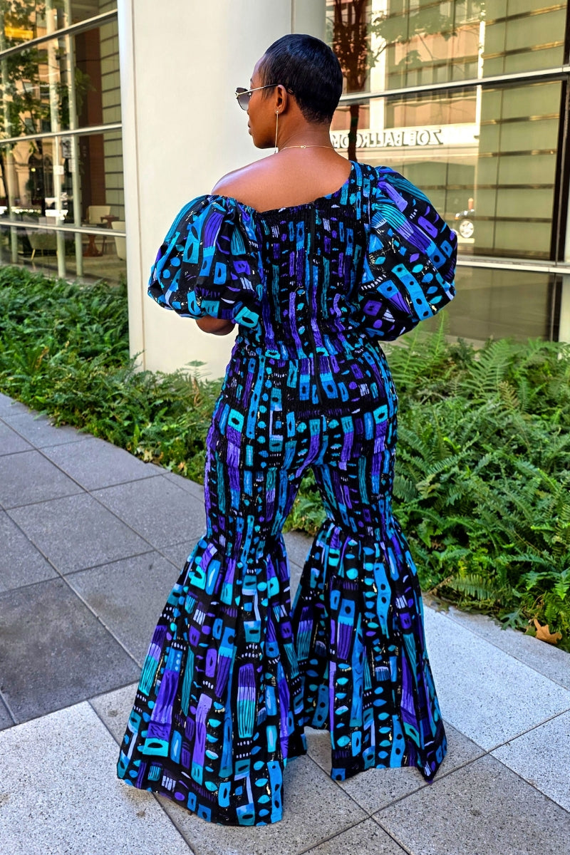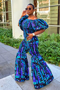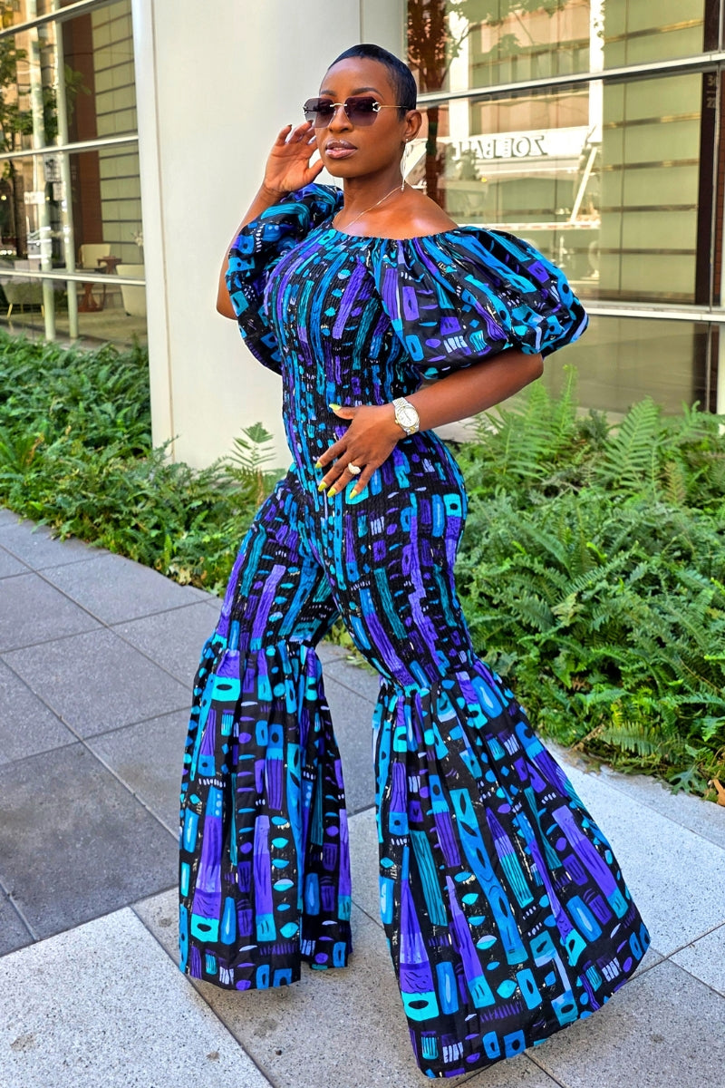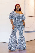 ✨ ELLY Ankara Jumpsuit – One-Shoulder Bell Bottoms