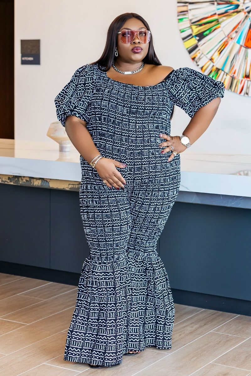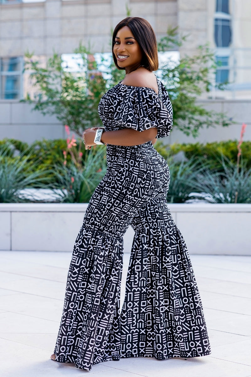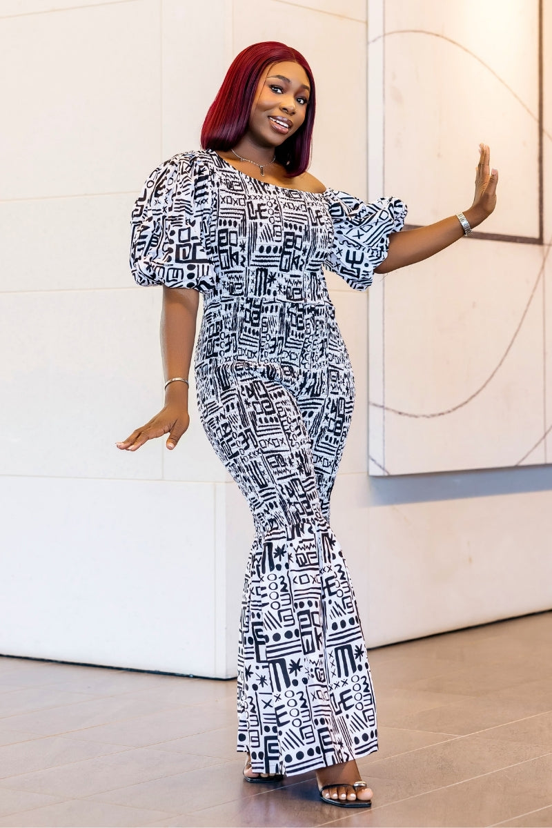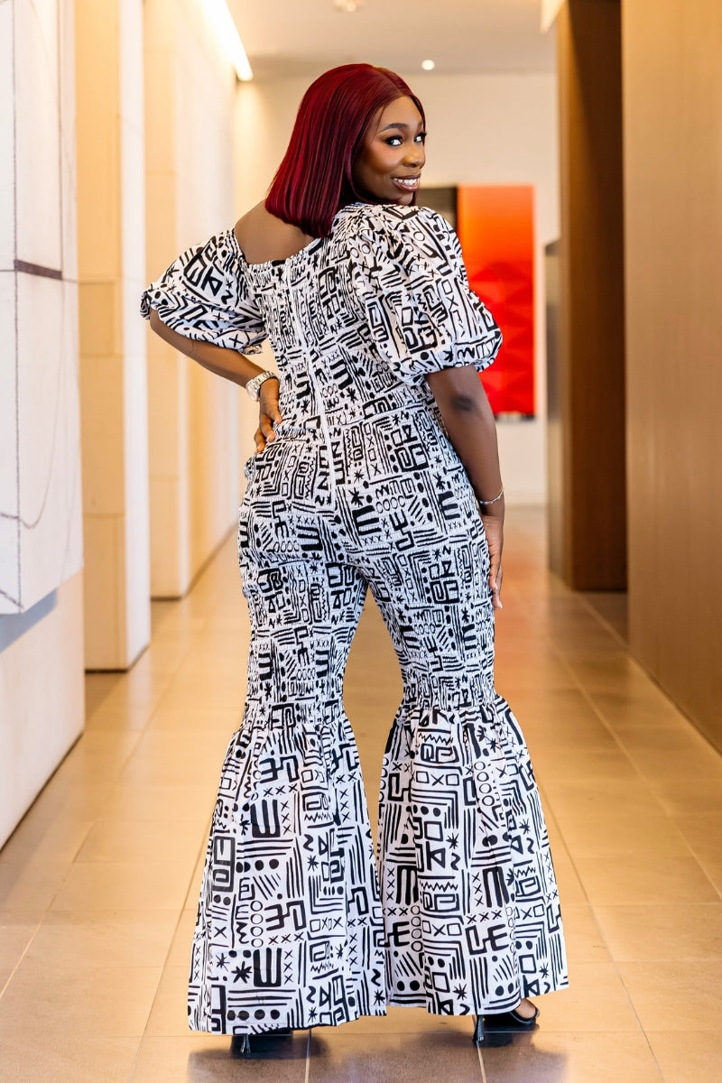 ✨ ELLY Ankara Jumpsuit – One-Shoulder Bell Bottoms