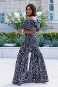 Style Details: One-hand off-shoulder design, smoked bodice for a flattering fit, and wide bell bottoms for a chic silhouette.