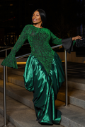 The fitted upper body hugs your curves comfortably, while the raw silk flows from the hips for an elegant, timeless look. Finished with long statement sleeves and a rich two-tone design, this dress is truly a showstopper.
