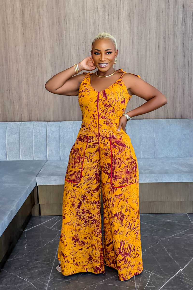 The Moyo Jumpsuit is a stunning piece crafted from high-quality Adire fabric, showcasing premium, hand-dyed material with unique traditional patterns. This jumpsuit effortlessly combines cultural artistry with contemporary design.