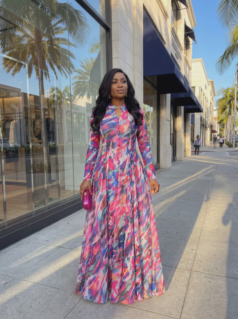 Turn heads in the Riviera Bloom Mesh Maxi Dress, designed in a vibrant abstract print with a flowing full length silhouette. Crafted from lightweight mesh fabric, it offers an airy feel with elegant movement and a flattering fit and flare shape. Finished with a refined neckline and long sleeves, it is perfect for any elevated occasion.