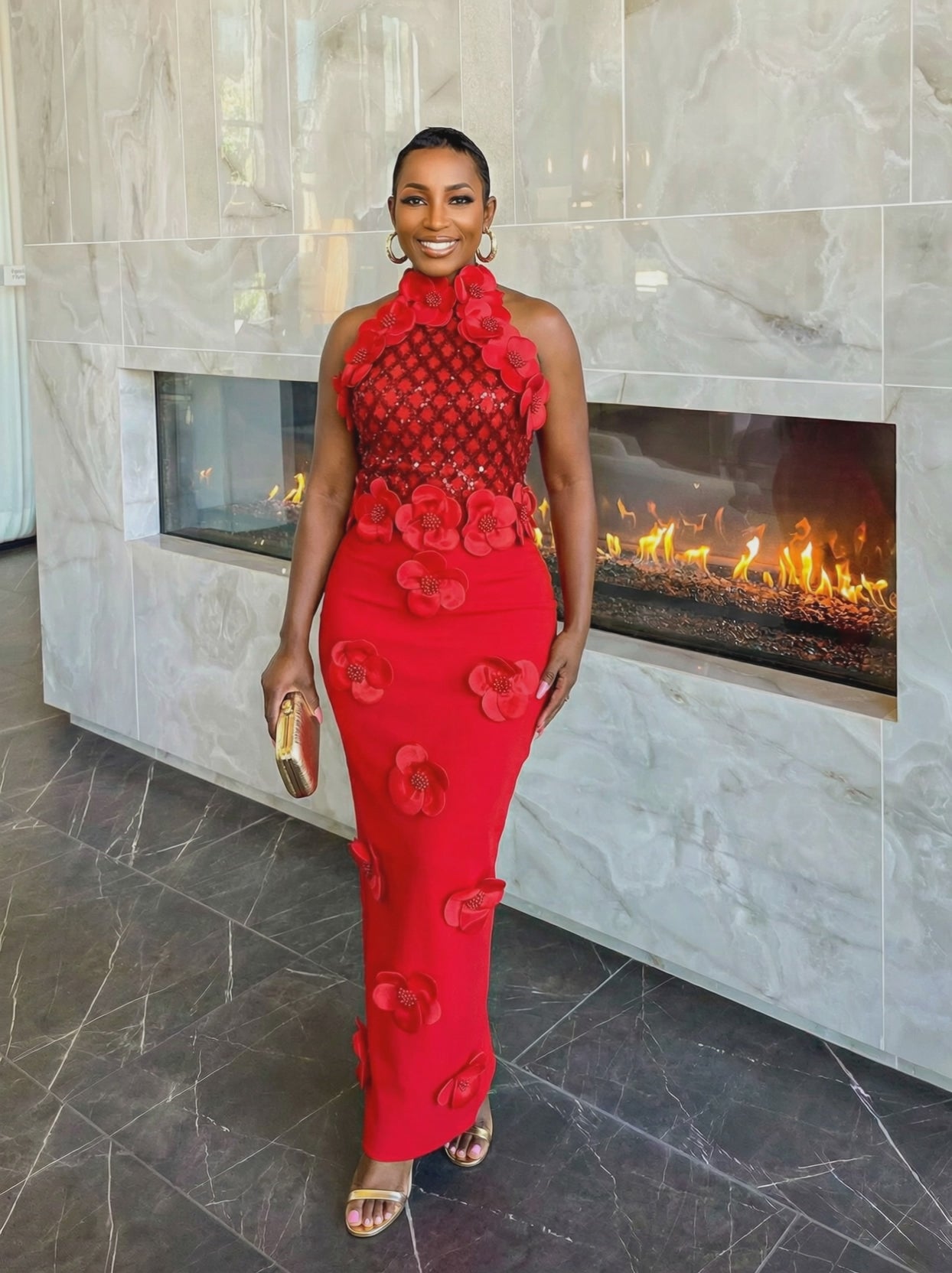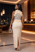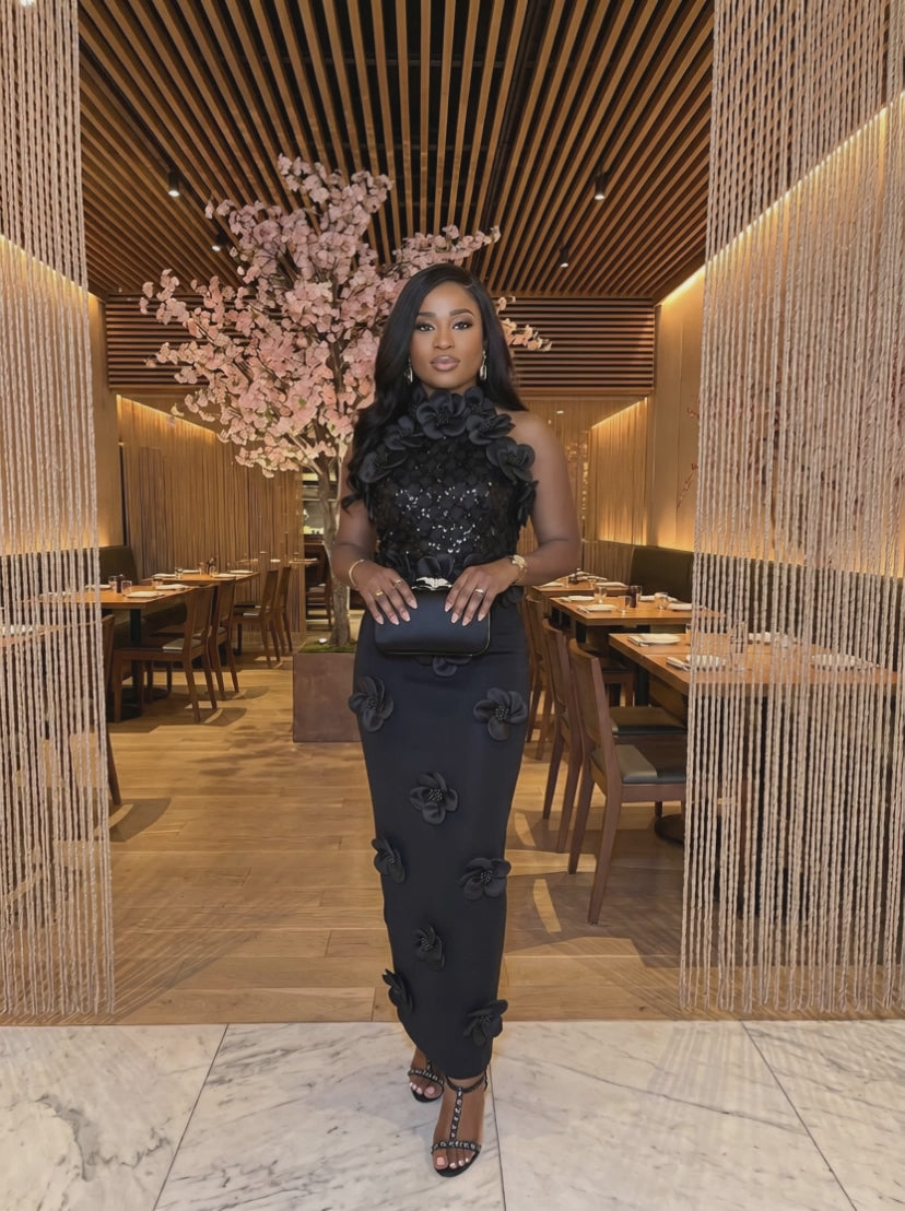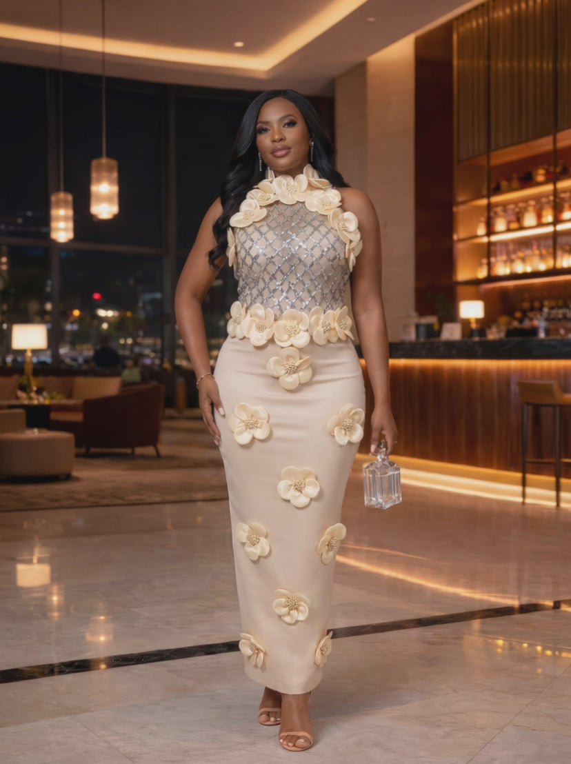 Make a bold yet elegant statement in the Rose 3D Dress. Crafted from structured bandage fabric, this striking piece hugs the body beautifully while offering support and shape. The bodice is adorned with intricate three dimensional floral appliqués and delicate embellishment, adding rich texture and luxury to the design. The sleek silhouette flows smoothly down the length, creating a refined and confident look.