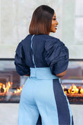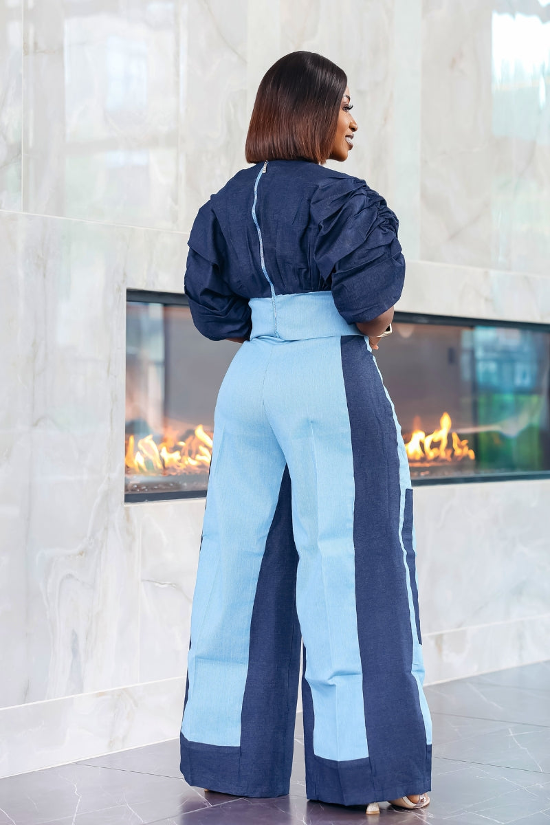 Crafted from premium denim, this luxurious set blends detailed craftsmanship with modern elegance.