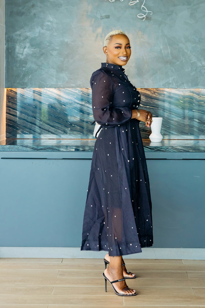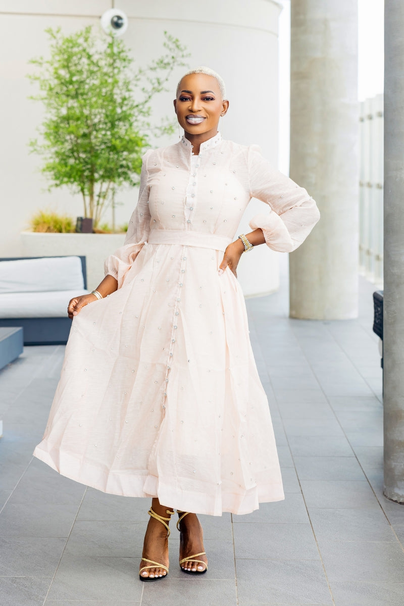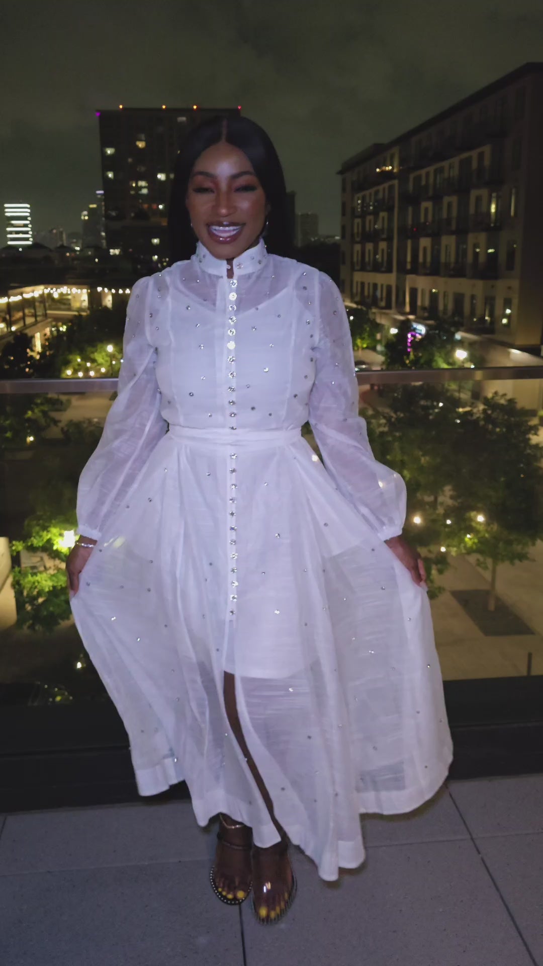 Step into your spotlight with the Snow Dress — a radiant showstopper designed to dazzle day or night. Made from ultra-lux linen fabric and adorned with sparkling rhinestones, this midi-length A-line dress flows gracefully while hugging your upper body in all the right places.