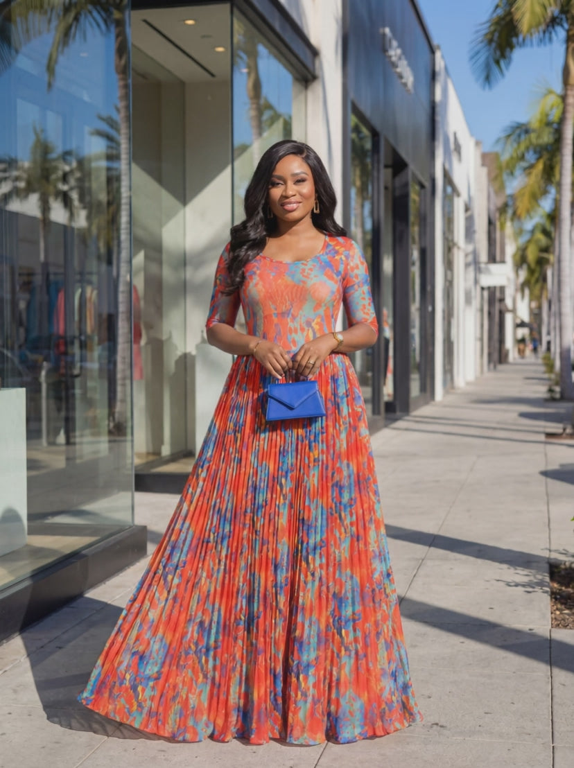 Bold and effortlessly elegant, the Sunset Mesh Maxi Dress features a flowing full length silhouette in a vibrant abstract print. Crafted from lightweight mesh fabric, it moves beautifully with an airy feel while offering a flattering fit. Designed with a soft neckline and elbow length sleeves, it is perfect for making a statement from day to evening.