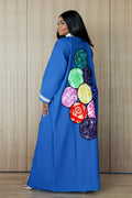 👘 Kimono: Crafted from premium lux crepe fabric, featuring exquisite Adire patchwork details on the back and intricate trim accents along the edges for a refined finish.