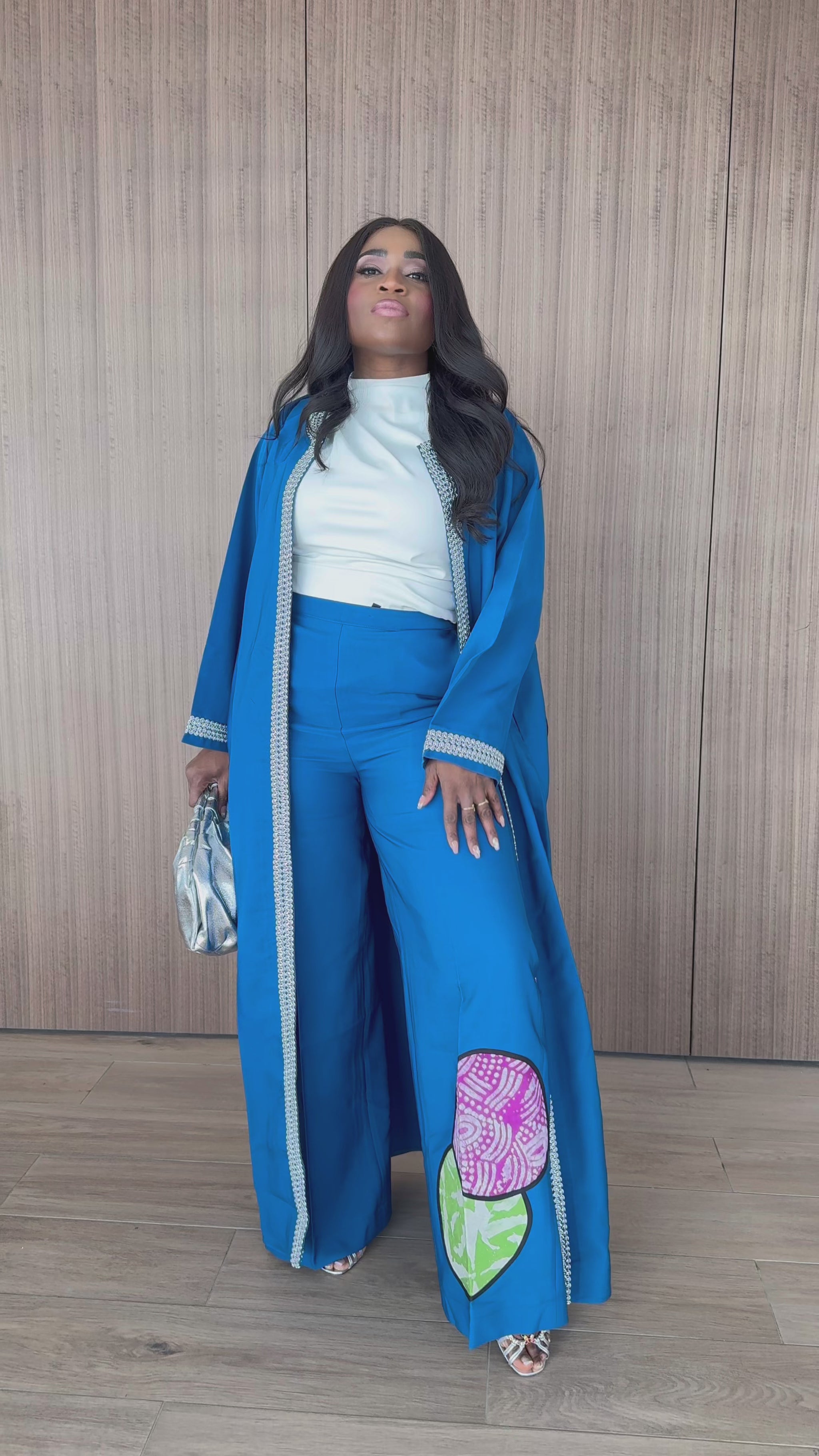 👖 Pants: Designed with coordinating Adire patch details, full-length wide-leg cut, and a comfortable tailored fit for effortless grace.