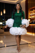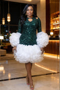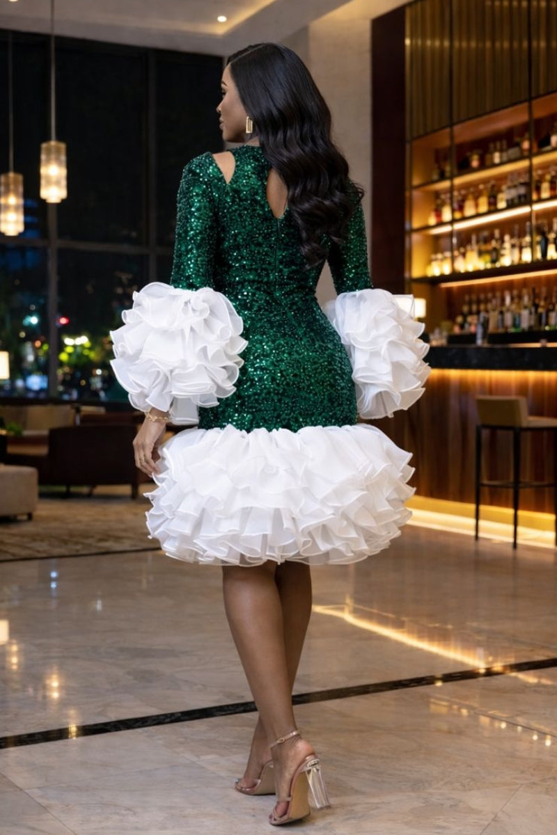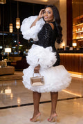 Make a stunning entrance in the Tutu Dress. This eye-catching piece blends velvet sequin fabric with soft chiffon ruffles for a look that is bold, feminine, and unforgettable.